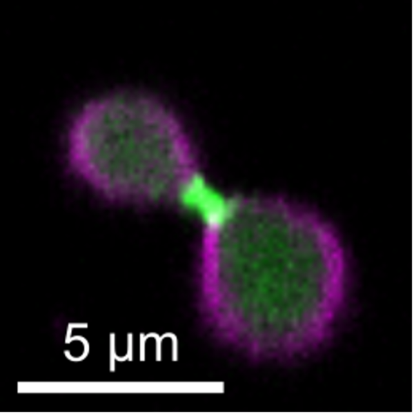 Figure 1 Confocal image of a liposome (magenta) constricted by cell-free expressed FtsZ (green) and FtsA (not labeled).